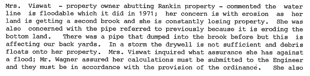 Viswat also asked for assurance against future flooding. She received what reads as a head-scratching response, according to the minutes. A board member “assured her calculations must be submitted to the engineer and they must be in accordance with the provision of the ordinance.”