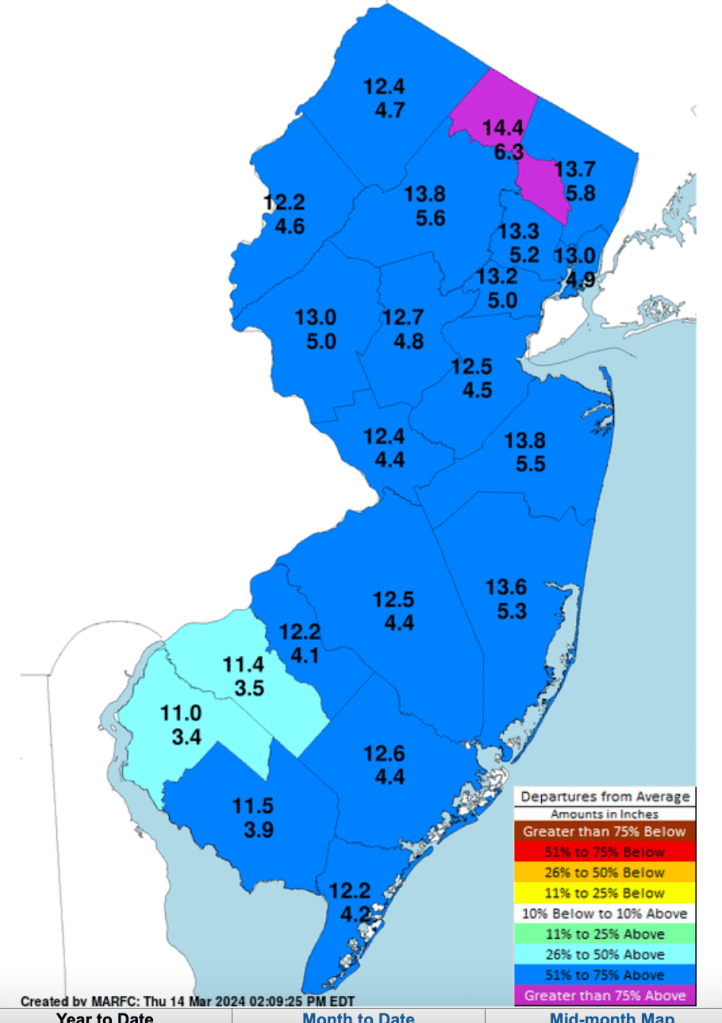 Middlesex County has had 12.5 inches of precipitation since Jan. 1, according to the National Weather Service. That’s 4.5 inches above the county’s average for that period in a typical year.