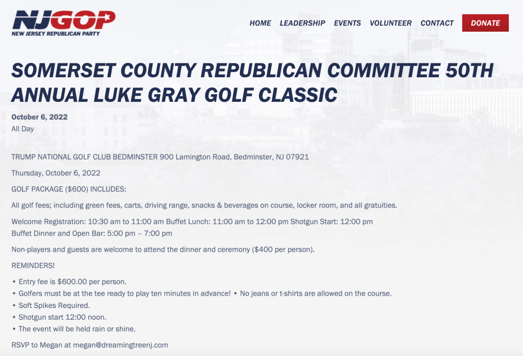 The Somerset County GOP held its annual Luke Gray Golf Classic at Trump National on Oct. 6, 2022 and July 18, 2023, according to past online posts still viewable on state and local Republican Party websites. Gray, a former Watchung mayor, served as chairman of the Somerset County Republican Organization from 1955 until his passing in 1984.