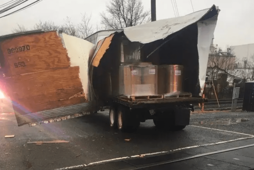 On Feb. 11, 2020, a train struck the back of a truck, tearing open its cargo area. The rear of the truck was over the tracks when it was hit. No one was injured.