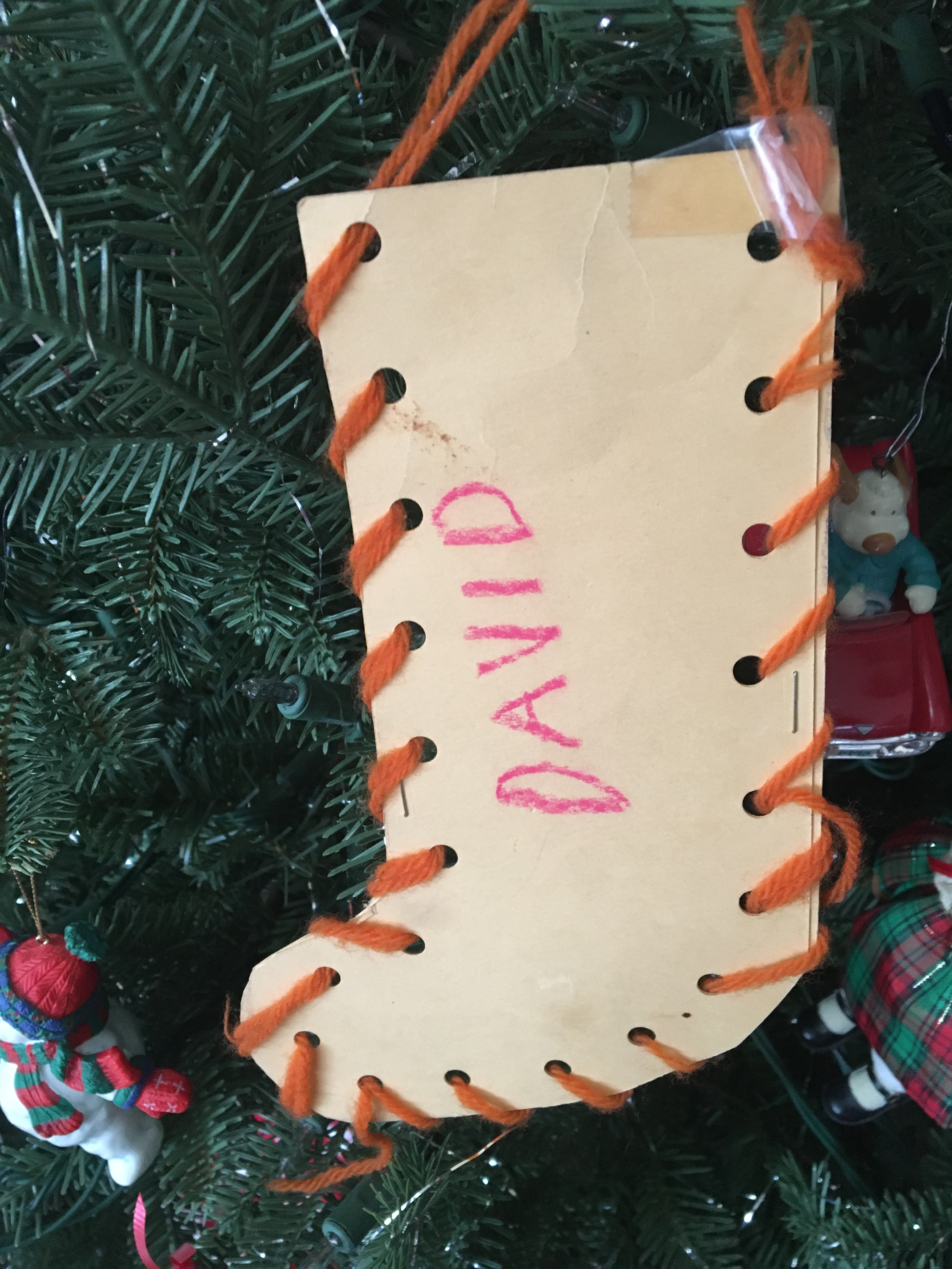 But he is priceless, just like the yellow Christmas stocking, held together with orange yarn. I even wrote my name on the stocking using fairly neat crayon penmanship for a first- or second-grader.