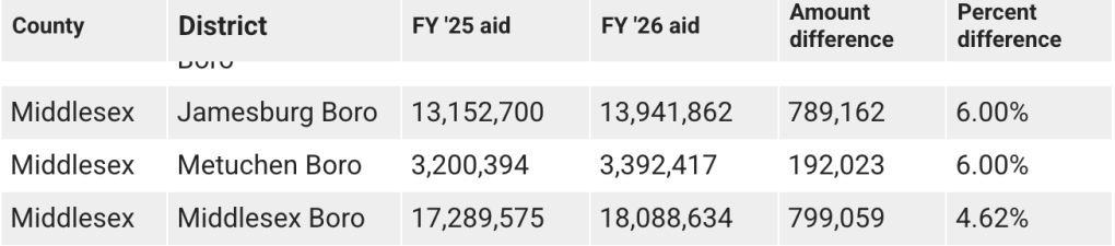 The K-12 Middlesex district’s state aid for 2025-26 was announced at $18,088,634. That’s a 4.62% increase from the $17,289,575 received during the current academic year.