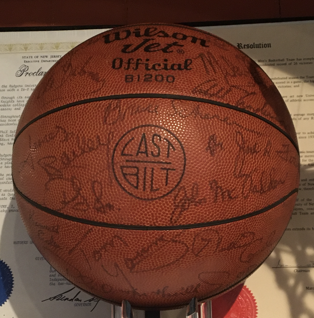 Rutgers’ 1975-76 men’s basketball team that went 26-0 in the regular season and made it to the NCAA Tournament’s Final Four gets ample space at the exhibit. There’s plenty of other Scarlet Knights relics including the football that Jeremy Ito kicked through the uprights to clinch the memorable home gridiron win over #3 ranked Louisville in November 2006.