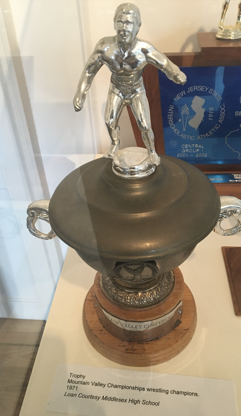 Plenty of Middlesex County high school sports mementos are displayed. Middlesex High, whose teams always have a supportive fan base, get their due in that part of the exhibit.