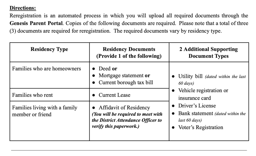 Each category has different mandated primary documents. Homeowning familes can produce a deed, mortgage statement or borough tax bill. Renters must produce a current lease. Families living with a family member or friend must supply an affidavit of residency, and meet with the district’s attendance officer to verify the paperwork.