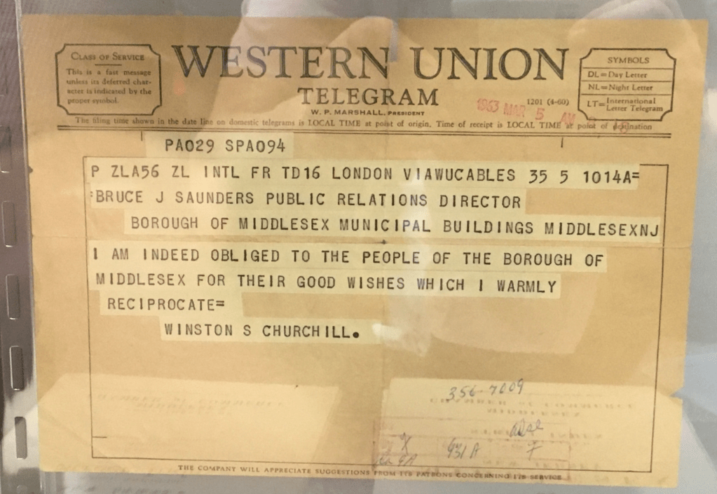 A telegram that British leader Winston Churchill sent to borough officials on March 5, 1963 thanks Middlesex residents for their “good wishes.” It was apparently spurred by an earlier message sent his way. The following month, Churchill was presented with honorary United States citizenship by President John F. Kennedy.