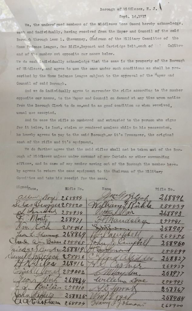 On Sept. 14, 1917, members of the Middlesex Home Guard signed a document acknowledging receipt of a rifle, bayonet and cartridge belt from the mayor and council.