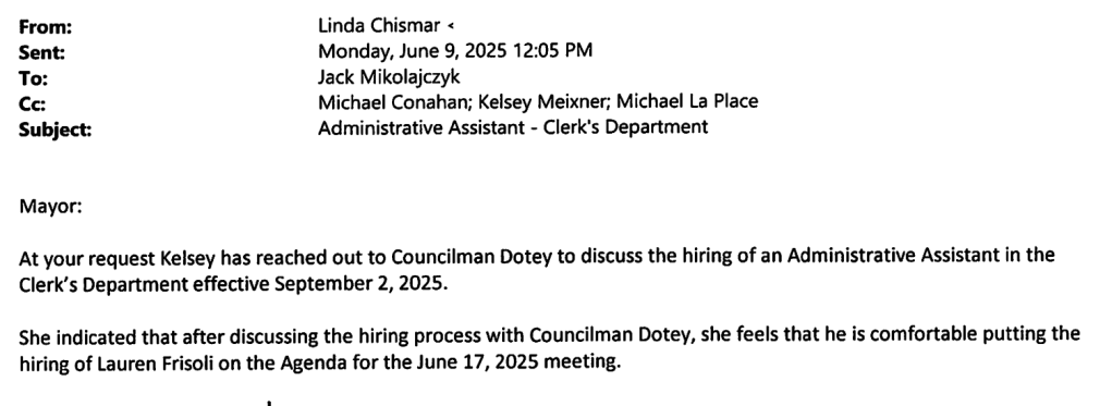 “(Meixner) indicated that after discussing the hiring process with Councilman Dotey,” Chismar wrote, “she feels that he is comfortable putting the hiring of Lauren Frisoli on the agenda for the June 17, 2025 meeting.”