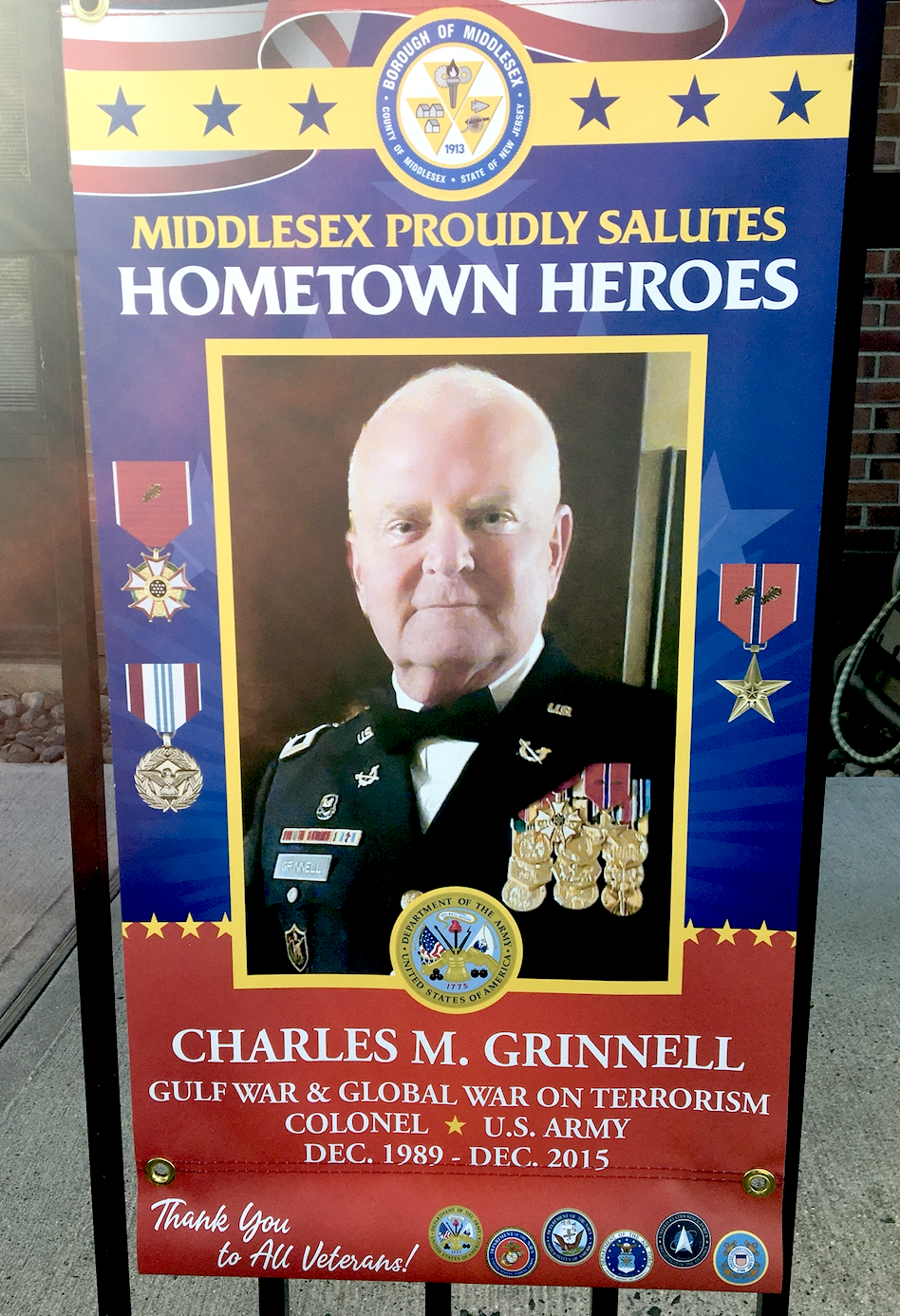 The banners incorporate gold into a red, white and blue color scheme giving them an eye-catching quality. Hometown Heroes banners have been hung on streetscapes in other Central Jersey towns in recent years.
