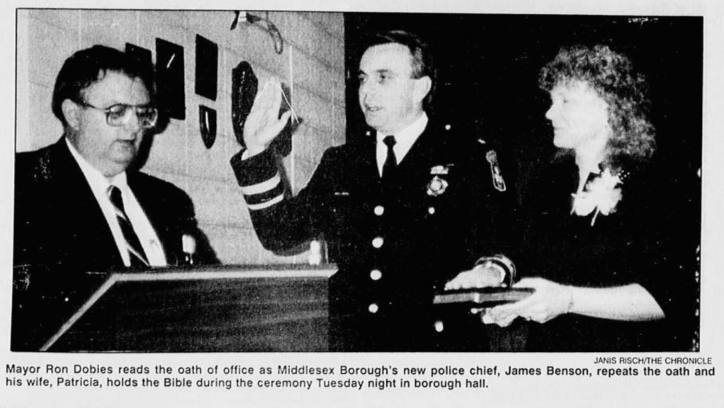 Benson is best known as a former borough police chief and officer. He headed the Middlesex Police Department for 18 years until retiring in 2010. Benson joined the MPD as a patrol officer in 1972. Mayor Jack Mikolajczyk and the Borough Council honored him on Tuesday, July 15 for his other contributions to the town – his efforts with various volunteer groups and projects.