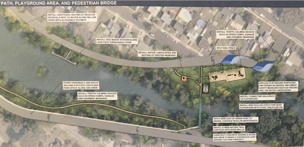 The parks’s trademark green foot bridge would be maintained, a four- to five-foot wide sidewalk along Oak Drive added, a nature trail created on the water’s edge and an overlook plaza placed on what is commonly called the sledding hill. A boardwalk is envisioned on the western edge of VCP’s Creighton Lake.