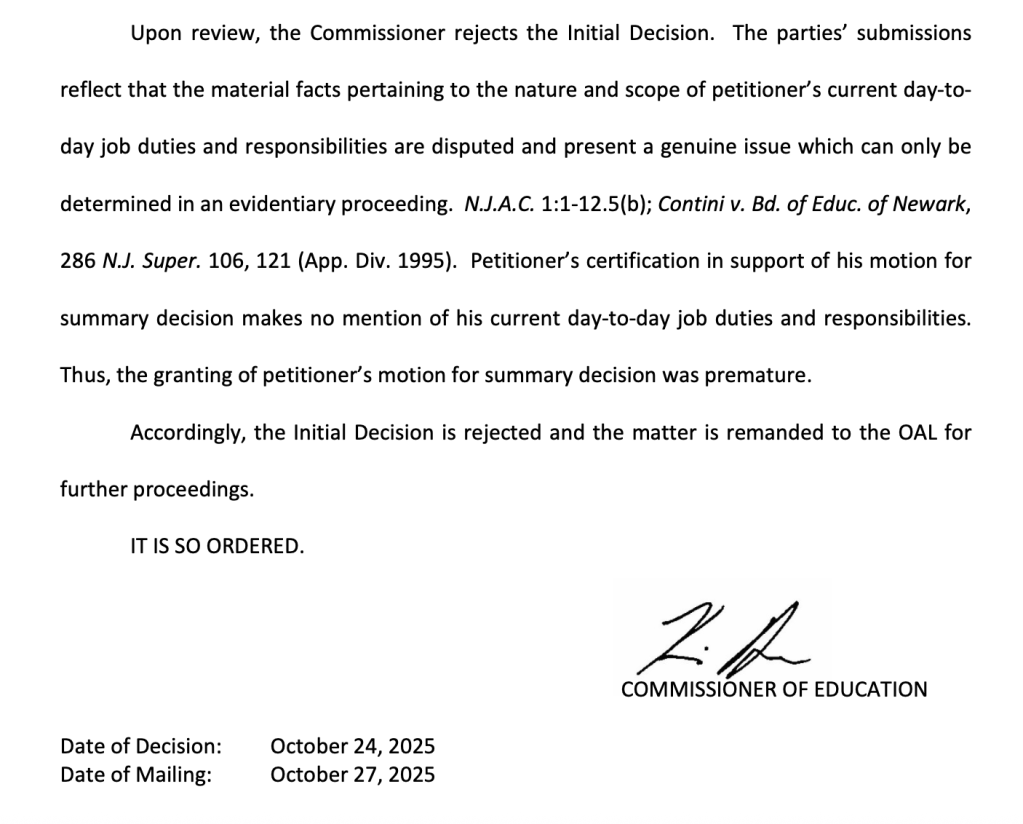 New Jersey Education Commissioner Kevin Dehmer has sent the case back to the state’s Office of Administrative Law (OAL), writing on Oct. 24 that an evidentiary proceeding should occur.