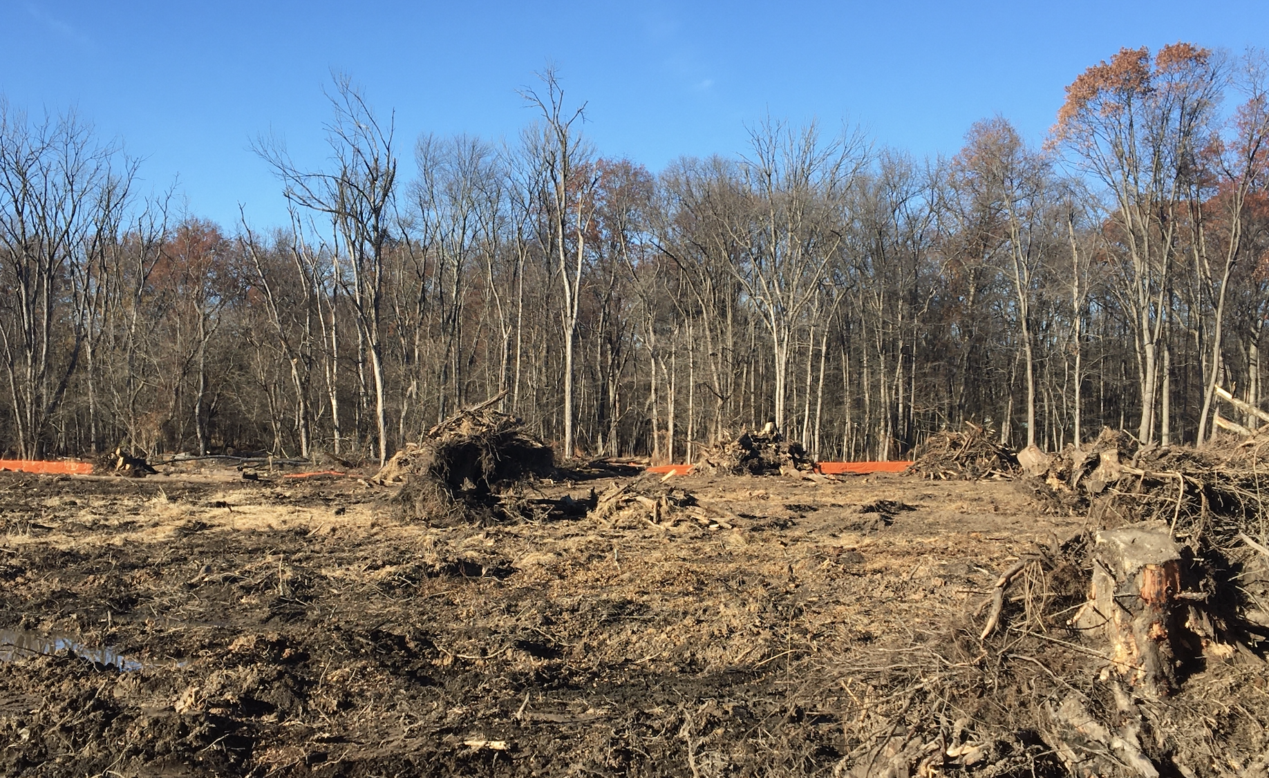 The clear-cut acreage will eventually hold a water retention basin, part of the U.S. Army Corps of Engineers’ Green Brook Flood Management Project. The much-discussed floodwall being constructed in Middlesex is visible a few hundred yards away.
